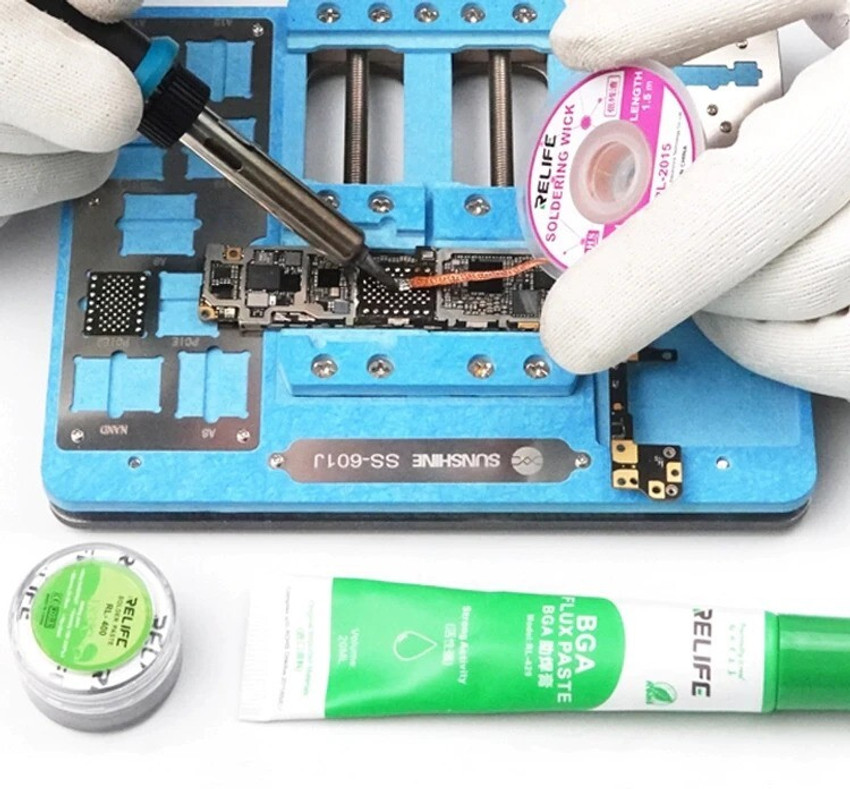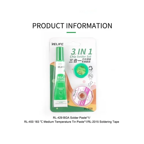 RELIFE RL-058 3 in 1 for IC Chip Solder Wick Flux Welding No-Clean Special Leaded Solder Paste Rosin Solder Oil Repair Tool. A set to solve the problem of chip soldering and Tube-type BGA solder paste, which Contains imported flux for a better soldering effect. The paste is delicate, lasting, and shiny, and the particles are only 20 ~ 38 microns Solder wick, pure copper material has a significant tin absorption effect, and a small amount of solder tape can be used to remove more solder.