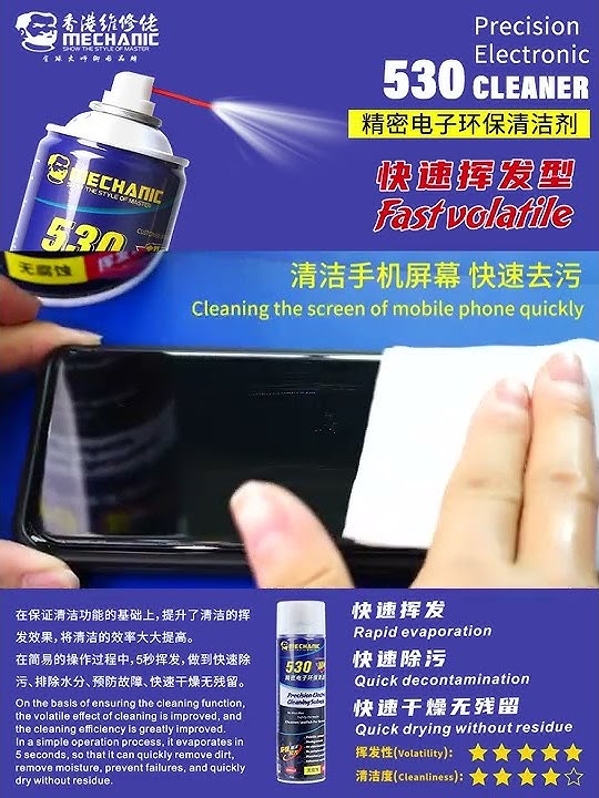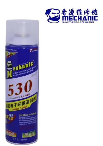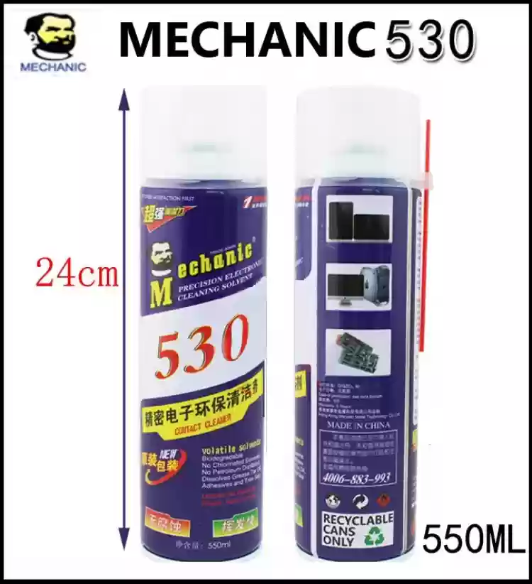 MECHANIC 530 Electronic Contact Cleaner for cleaning mobile phones screen, tablet, PCs, laptops, electronic products and the shell surface or plastic surface, electrical contacts, electronic components and circuit boards. Cleaning grease, dirt and stains. The FALCON 530 cleaning, highly volatile, no residue, water-based cleaning agent is safe without environmental corrosion.