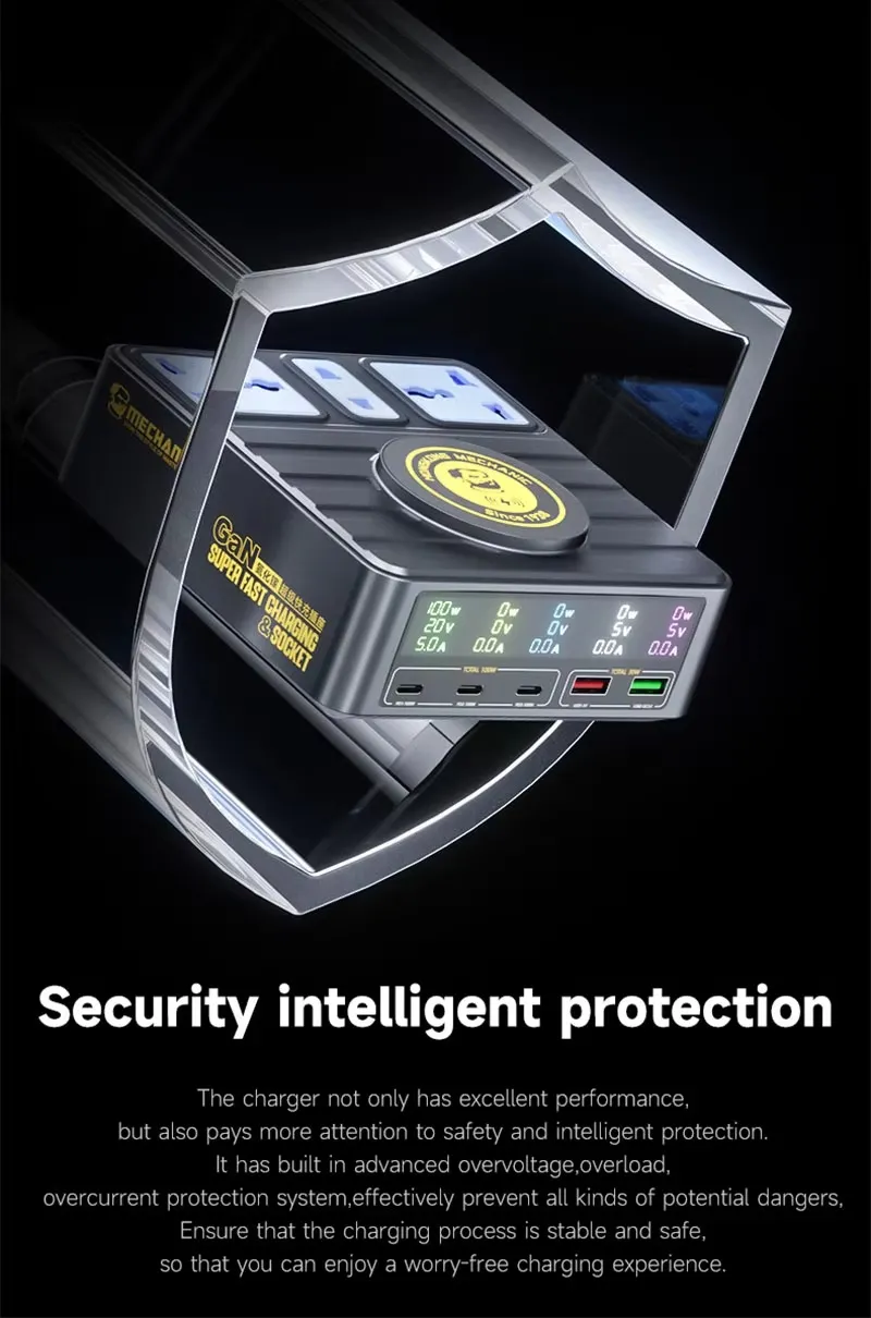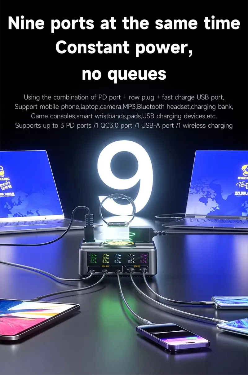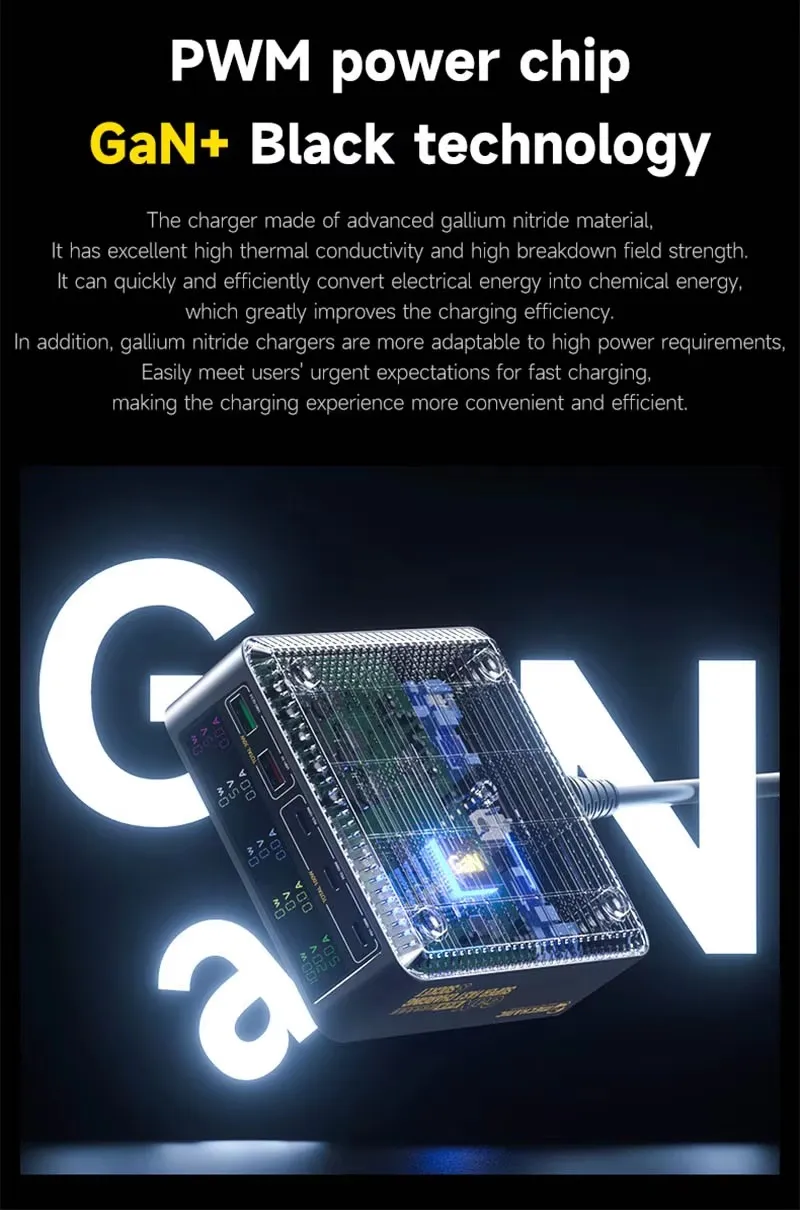 -Gallium nitride technology, PWM power chip, intelligent digital display, magnetic wireless 15W fast charging, intelligent protection, nine-port simultaneous charging, PD100W fast charging technology