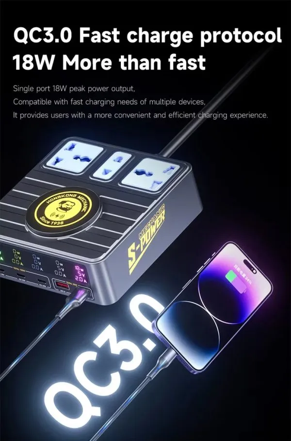 -Supports up to 3 PD ports /1 QC 3.0 port /1 USB-A port /1 wireless charging