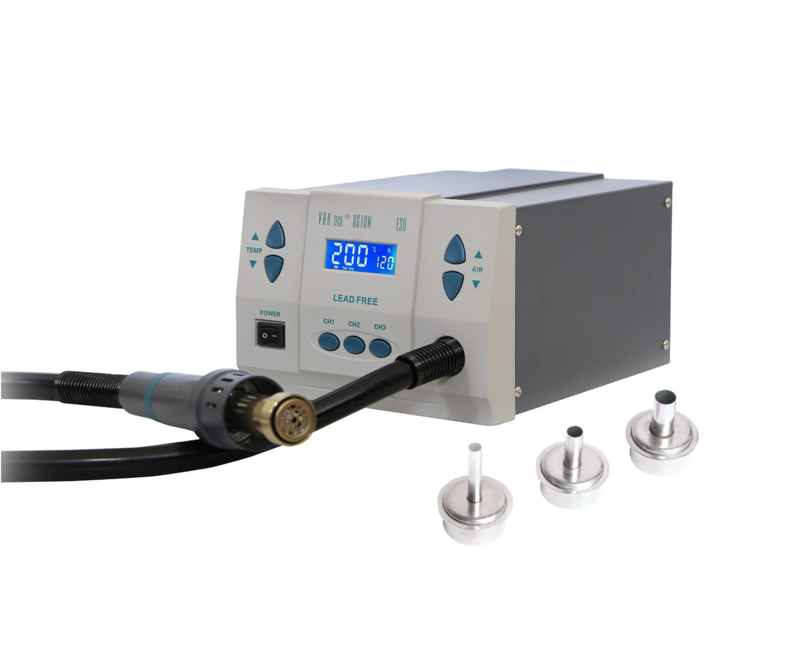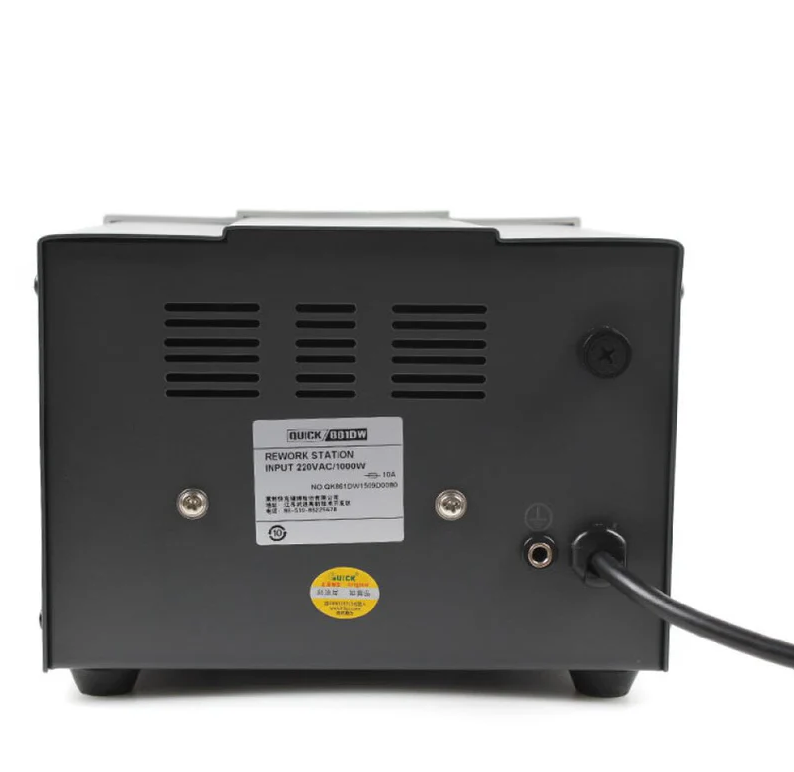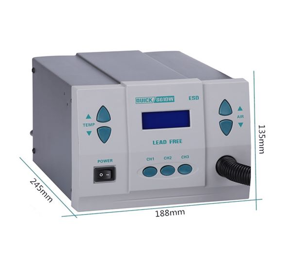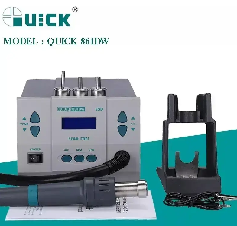 - The Quick 861DW ESD is an inexpensive hot air station with a high power of 1000 watt and it has a maximum airflow of 120 litres per minute. This device is designed for soldering SMD components such as SOIC, QFP, PLCC, CHIP and BGA. Furthermore, the Quick 861DW is also suitable for drying, removing paint, melting, heating and disinfecting surfaces. Due to the high power and a ceramic heating element, rapid heating to the desired temperature is possible. The 861DW ESD has three channels where the temperature and the amount of airflow can be set and these settings can be memorized by the device.