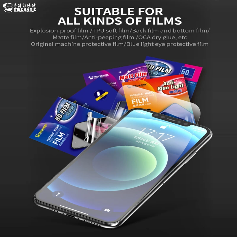 - Suitable for all kinds of films, such as explosion-proof films, TPU soft films, back and bottom films, original machine blue light eye protection films, anti-peep films, OCA dry glue, etc.