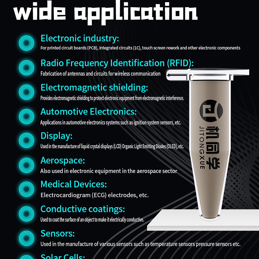 - Wide application: Electronic industry, Radio Frequency Identification (RFID), Electromagnetic shielding, Automotive Electronics, Display, Aerospace, Medical Devices, Conductive coatings, Sensors, Solar Cells, etc.