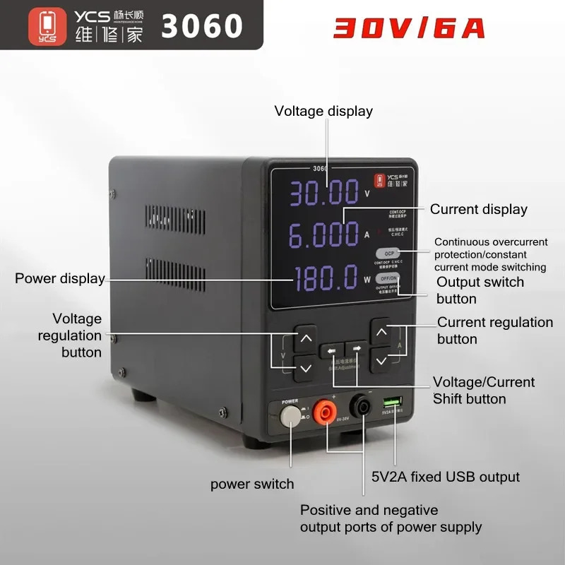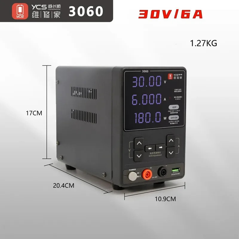 The YCS 3060 DC Power Supply is a high-performance, precision-regulated power source designed for mobile phone repair technicians, electronics enthusiasts, and laboratory professionals. With adjustable output up to 30V and 6A, it delivers clean, stable, and reliable DC power, making it ideal for a wide range of applications such as battery activation, logic board repair, and circuit testing.
