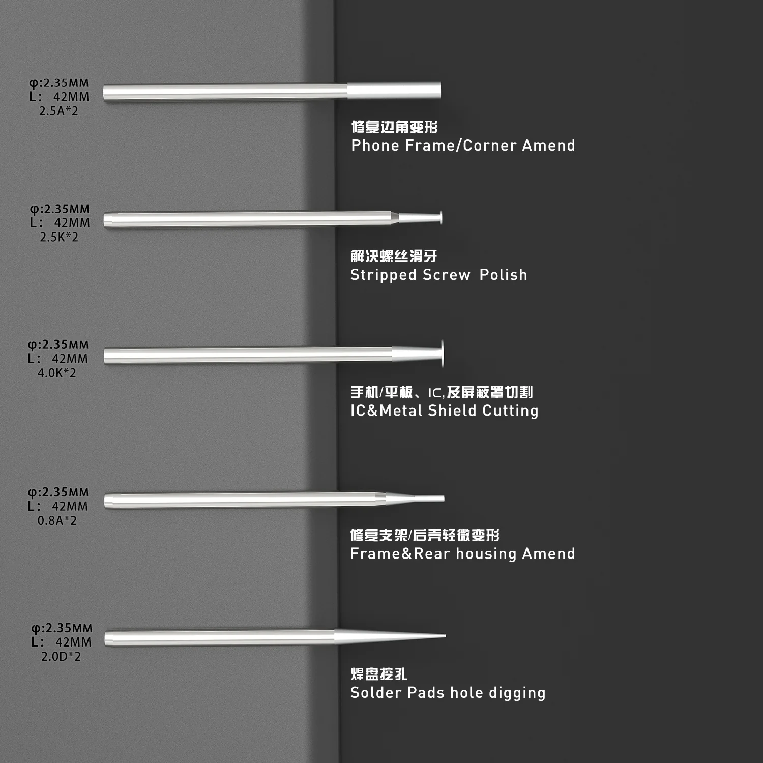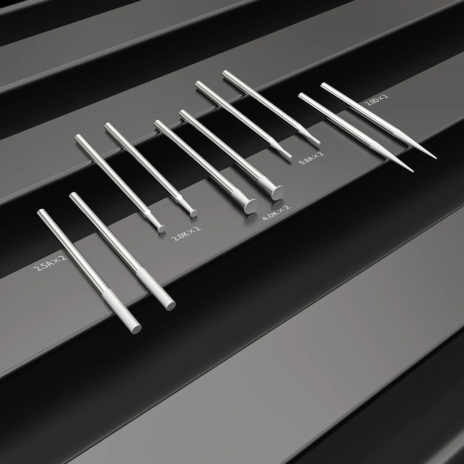 The 2UUL DA82 Replacement Tips are a set of precision tips made for the 2UUL Polish Drill Pen. They are used in fine electronics work for polishing, smoothing, or modifying small surfaces on components like ICs, connectors, solder pads, metal shielding, frames, etc