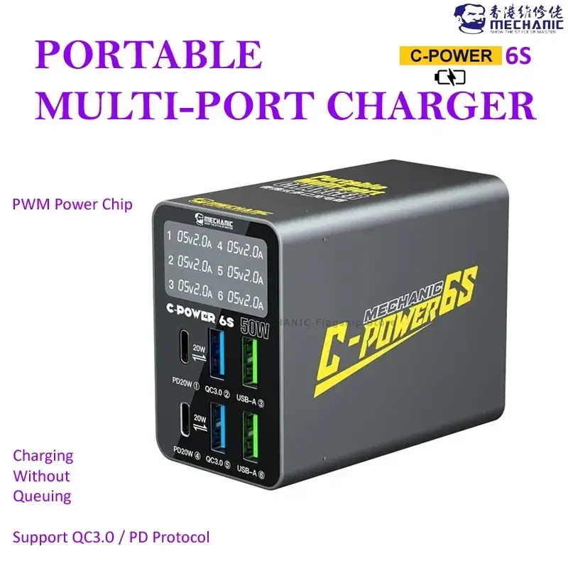 The Mechanic 50W Portable Multi-Port Charger is a high-efficiency smart charging station engineered for fast, stable, and simultaneous charging of multiple devices. With a total power output of 50 watts and six intelligent USB ports, this charger is ideal for mobile repair shops, service centers, offices, and homes where multiple smartphones or gadgets need to be powered up at the same time.