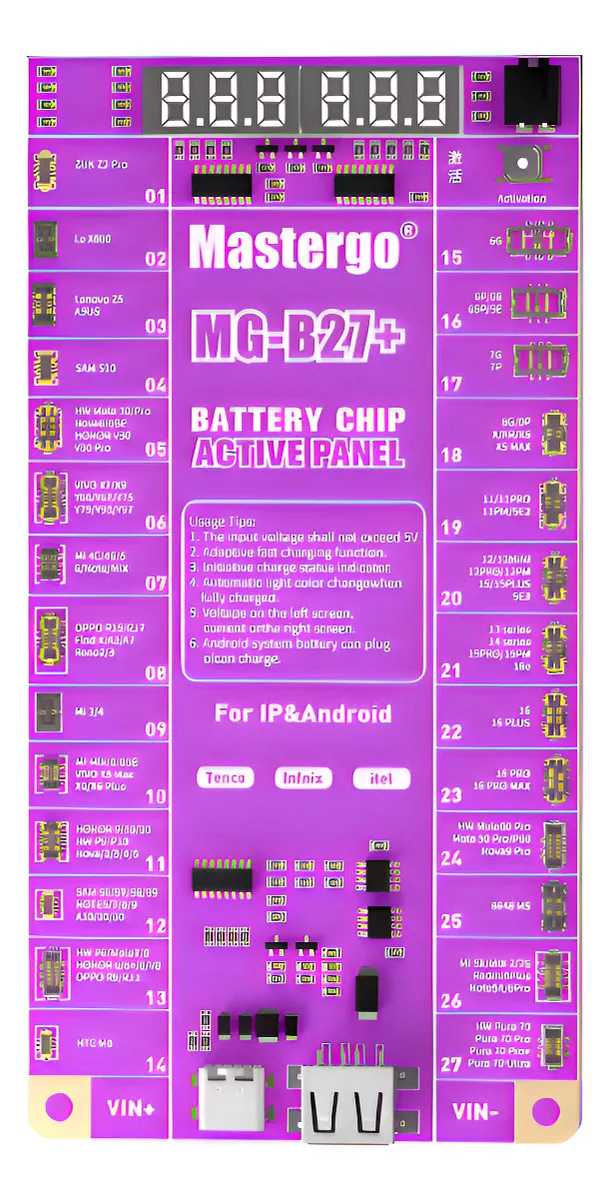 The MasterGo B27+ Battery Activation Board is a professional mobile repair tool designed to activate, wake up, and boost dead smartphone batteries safely and efficiently. Specially engineered for iPhone and Android batteries, the B27+ helps technicians quickly identify battery health and restore charging function in deeply discharged cells.