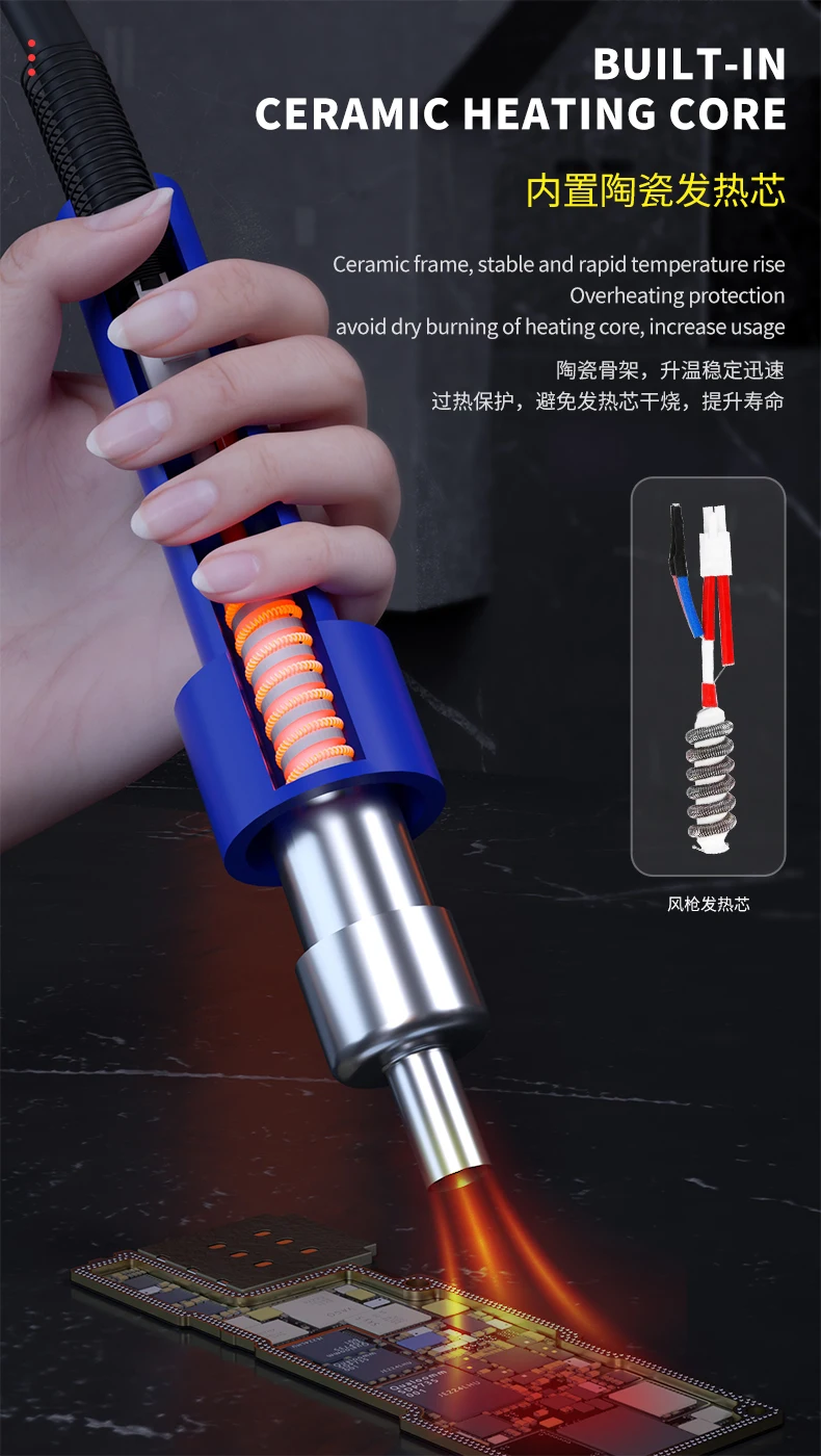 - Low noise, fast heating, desoldering station with two-scroll hot air