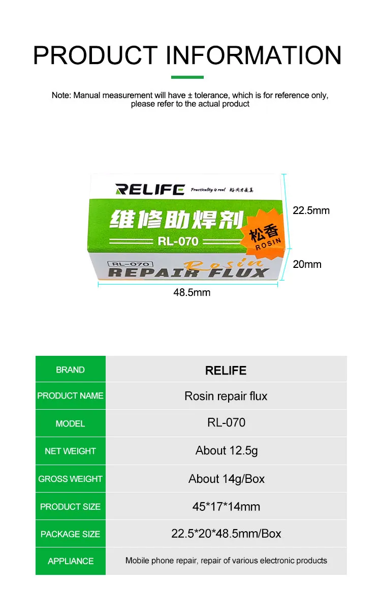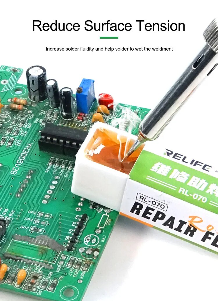 relife rl - 070 rosen paste / bit cleaner Features: 100% New Brand and High-Quality Fluxing excellent results, joint high-intensity Good insulation No corrosion, IC and PCB for no corrosive Smooth welding surface No deterioration, and no dry.