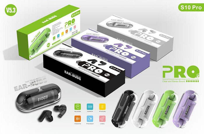 S10 Pro Wireless Earbuds Bluetooth-compatible earbuds with 3 different sizes of ear tips for most ear canals.LED display of the power of the charging case and together earbuds, permitting you to know the power status of the wireless earbuds and charging case at any time. Fine workmanship and good performance. Easy to use. Long service life.