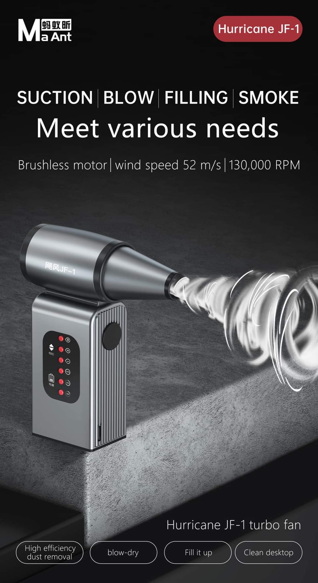 MaAnt JF-1 Mini Turbo Jet Fan Portable Violent Blower. MaAnt Hurricane JF-1 Violent Turbo Fan for Clean The Dust Phone Computer Dedusting Mainboard Cooling repair tool. MaAnt JF-1 Storm multi functional suction blowing turbine fan. This Mini Turbo Jet Fan is your go-to for portable and potent airflow.