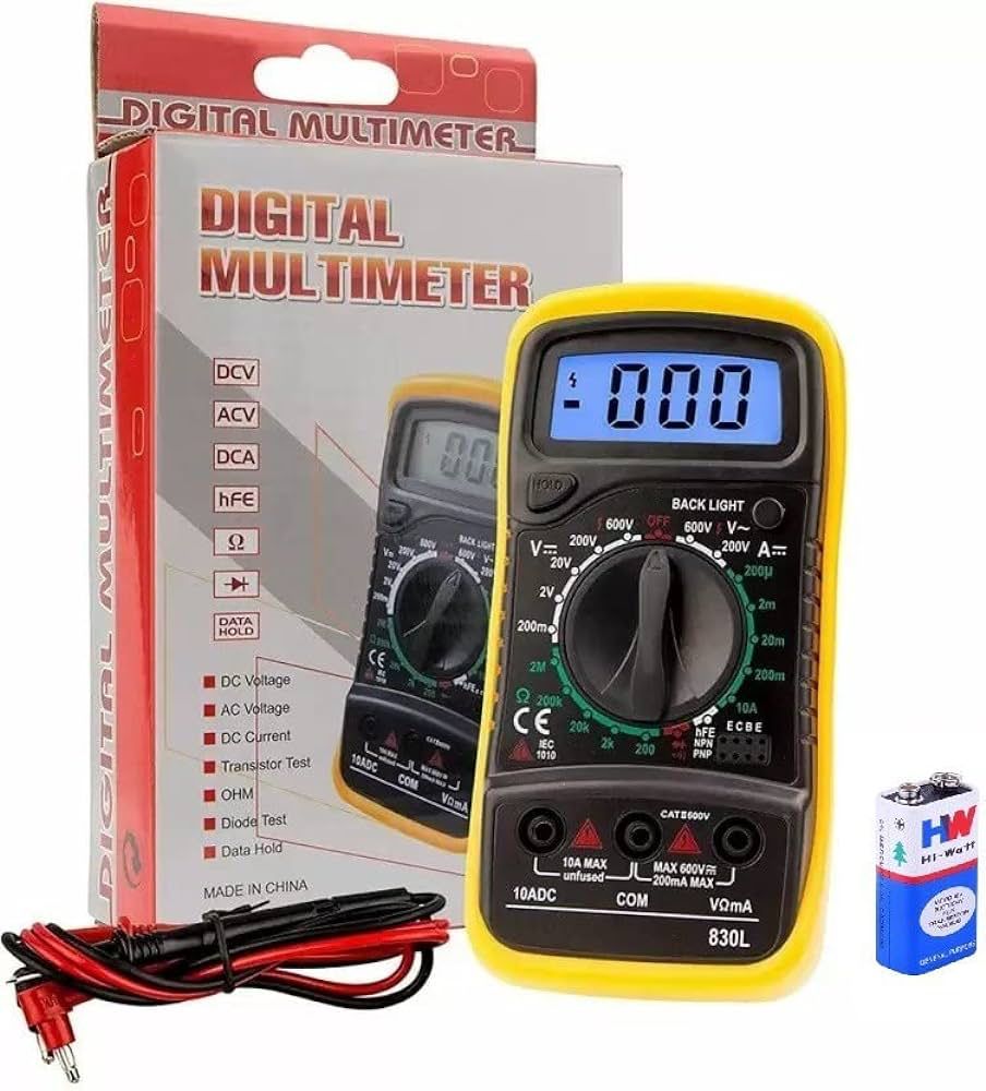 Digit multimeter that is very useful for general purpose electronic testing. This is a Battery operated Digital multimeter with proper insulation and clear display even in high light condition. This Multimeter is useful for AC/DC voltage testing, DC current and resistance testing as well as Diodes and Transistors can also be tested using this Multimeter. The package includes probes, battery and the multimeter.
