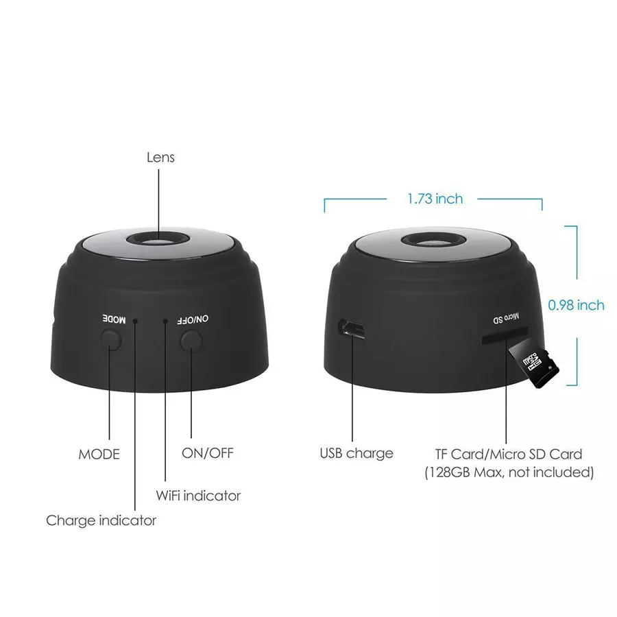 Item type:Mini WiFi camera Play software: VLCPlayer/SMPlayer Minimum illumination: 1LUX Continuous recording time: 1 hour or so Mobile operating system: for Android/iOS Viewing angle: 150 degrees Motion detection camera distance: 6 meters straight Compressed format: H.264 Operating humidity: 15--85% RH Operating temperature: -10-60 degrees Celsius Computer operating system: for Windows/Mac OS X Recording range: 5m Storage temperature: -20-80 degrees Celsius Web browser: IE7 and above, chrome, firefox safari. etc Model: Wireless WIFI MINI IP Camera Video format : AVI Resolution: 1080P Memory card type: TF card (not include) Frame number: 25 Package Include: 1x Mini WiFi camera 1x Snake USB Cable 1x Magnetic Rotation Mount 1x User Mumal 1x USB Cable